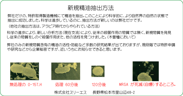 ・科学の進歩により新しい分析方法(現在支流)により従来の殺菌作用の物質ではなく新規物質を発見し従来の 物質をしのぐ殺菌作用、また他の活性を見つけました。(木曽檜において)
