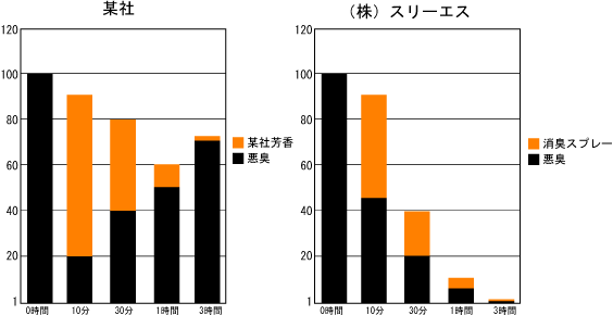 一般の消臭スプレーは異臭・悪臭を消すのではなく強い芳香によって被せているだけです、芳香 が無くなれば、また異臭・悪臭が出てきてしまいます。